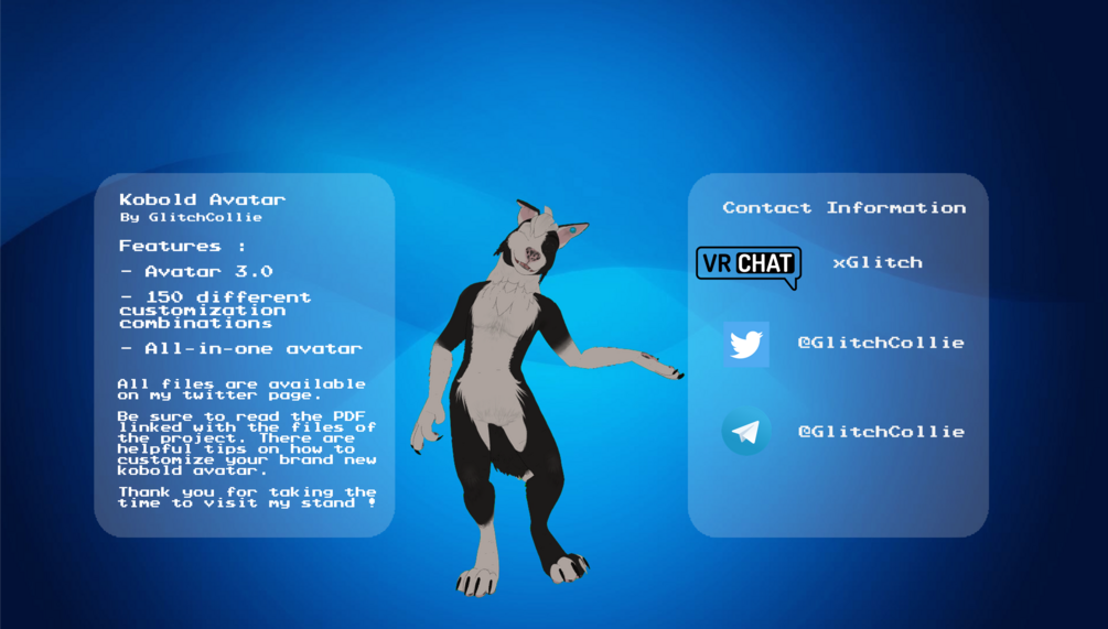 An all-in-one kobold avatar using Avatar 3.0 new functionality for VRChat with over 150 combinations of customization available in one single avatar ! Every files plus a PDF containing some FAQs and tutorials to customize your own avatar to your liking are in the attached zip file.